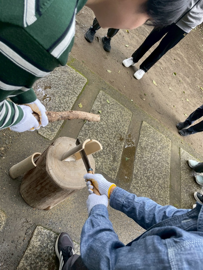 事前に準備していた染谷家の敷地内の竹をにナタやノコギリ、電動ドリルを使って、加工を施していきました。