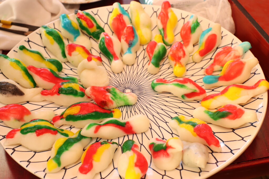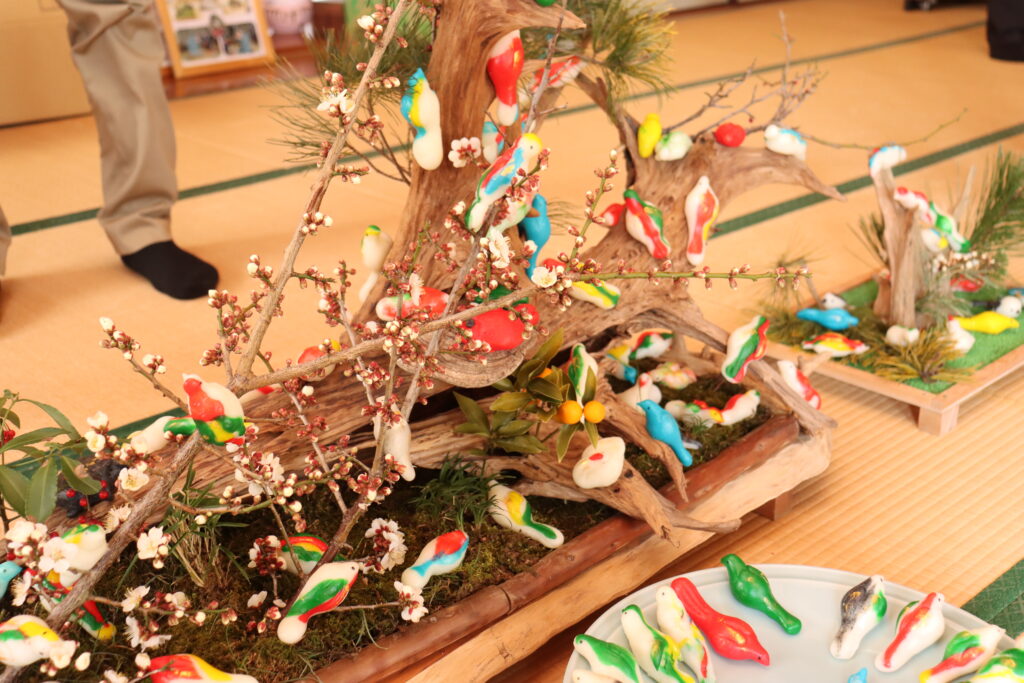 鷲野谷地区の鳥びしゃはしんこ餅に赤・緑・黄色の色をつけて鳥の形を作り、「鳥木」と呼ばれる木に飾りつけ、星神社に奉納するのが特徴です。